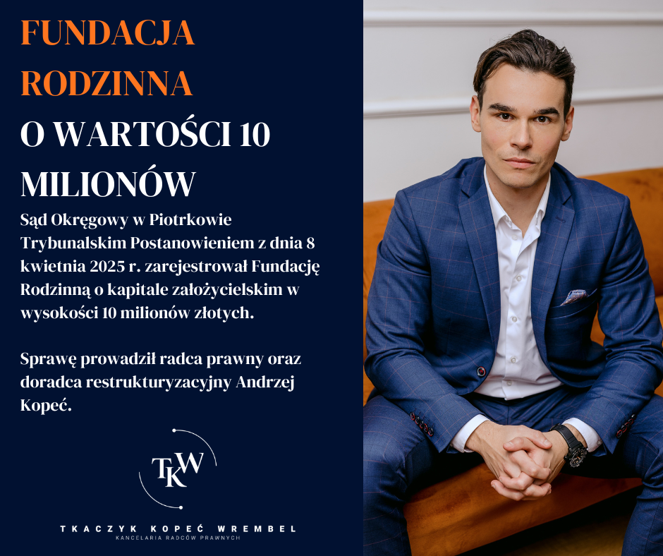 Kancelaria TKW (Tkaczyk Kopeć Wrembel) specjalizuje się w kompleksowej obsłudze prawnej przedsiębiorców, w tym w zakładaniu i prowadzeniu fundacji rodzinnych. Nasz zespół posiada praktyczne doświadczenie potwierdzone sukcesami takimi jak rejestracja fundacji o kapitale 10 milionów złotych.